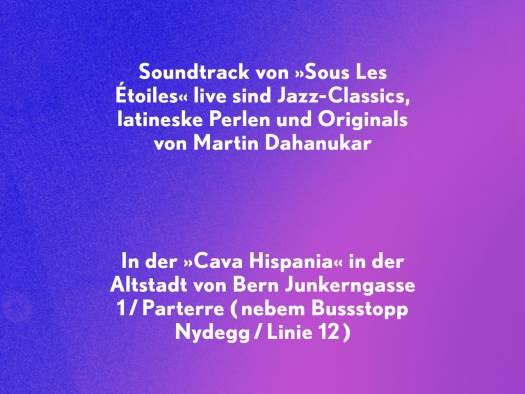 »Sous Les Étoiles« zelebriert seit 11 Jahren den Zauber der Nacht und ist der romantic Jour fixe des Berner Nachtlebens im Winterhalbjahr. People Music aka Jazz: Die »Sous Les Étoiles«-Band erfüllt den frühen Abend after work zu tasty Drinks & Tapas mit Melos und Groove. Soundtrack sind Klassiker und Rares, latineske Perlen und Originals von Marteyn Dahanukar.