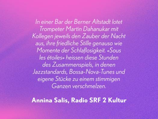 In einer Bar der Berner Altstadt lotet Trompeter Martin Dahanukar mit Kollegen jeweils den Zauber der Nacht aus, ihre friedliche Stille genauso wie Momente der Schlaflosigkeit. «Sous les étoiles» heissen diese Stunden des Zusammenspiels, in denen Jazzstandards, Bossa-Nova-Tunes und eigene Stücke zu einem stimmigen Ganzen verschmelzen.